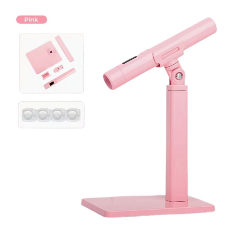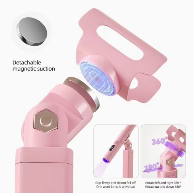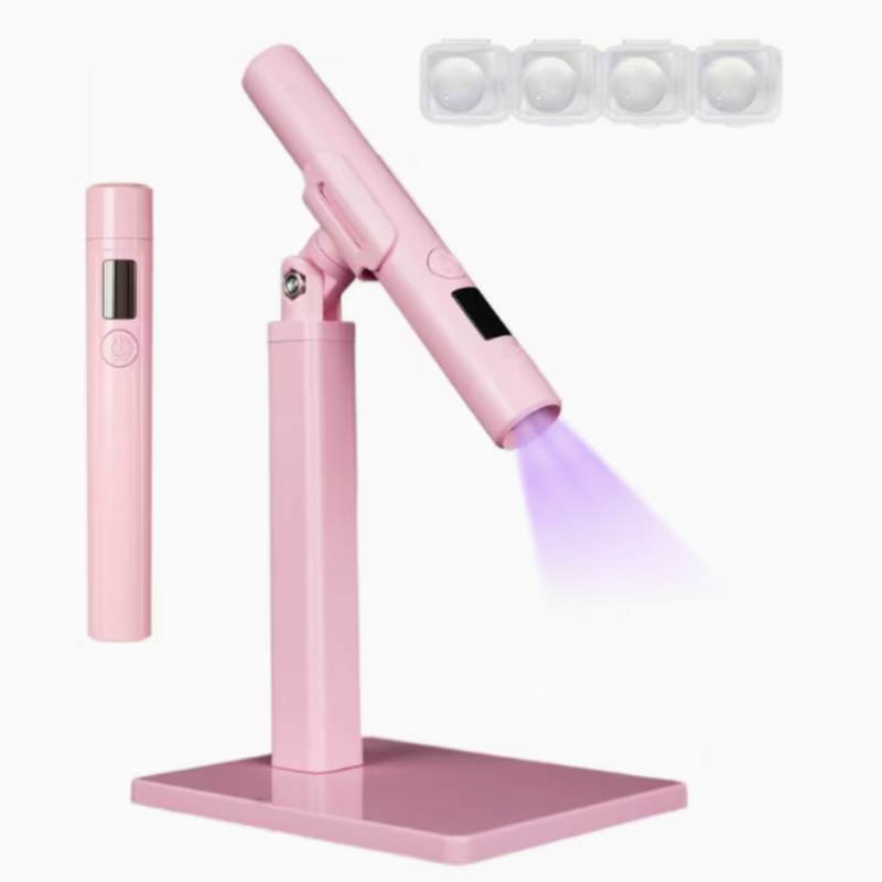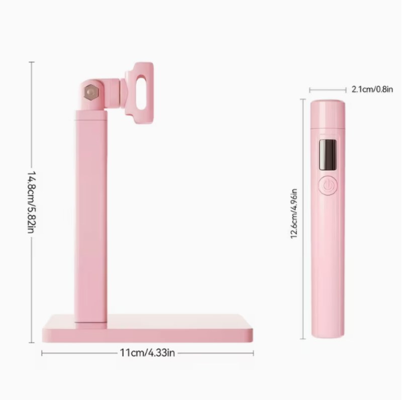 פנס ייעודי קטן לייבוש ועבודה מדויקת בציפורניים, עם מעמד רב-תכליתי בצבע ורוד .